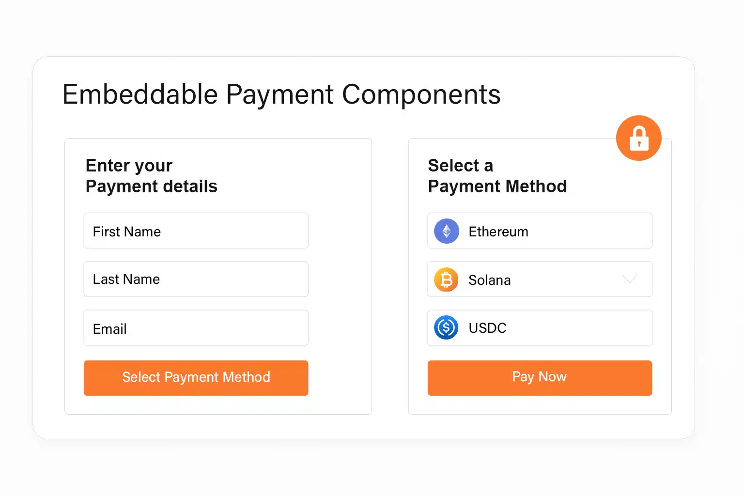 Embed fully customizable crypto payment widgets into your app or website. Align your brand seamlessly with crypto payments, along with enterprise-grade security and compliance.